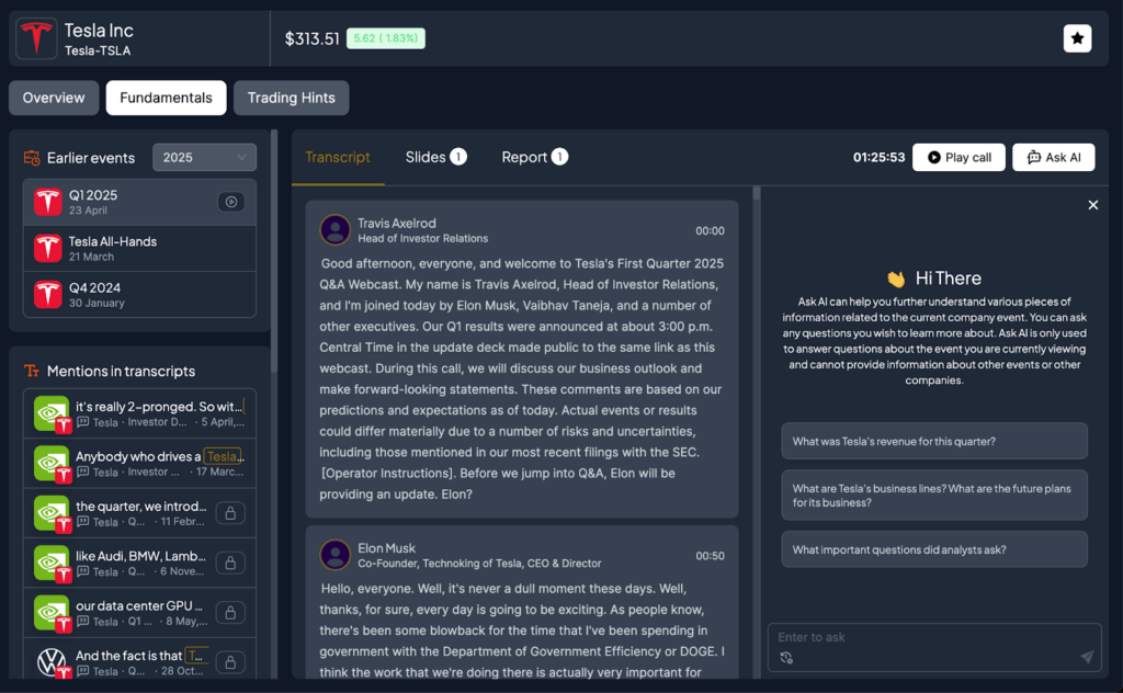 - 1Y event history (Calls, Transcripts & Slides)